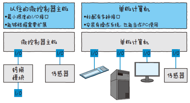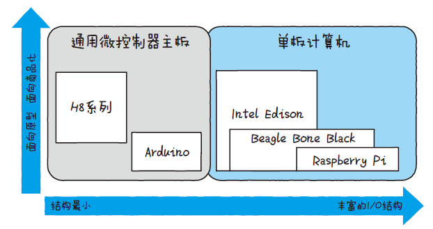 像Arduino、英特尔Edison 这些都是适用于原型设计,而且在通用性和扩展性的平衡方面表现优秀的产品。而Raspberry Pi 的目标是被当作PC 使用,所以没有能直接指向设备的模拟I/O 引脚。