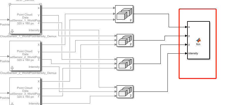 (5)一共添加4个 matrix 模块,并对应将三个传感器的 x 与 x,y 与 y,z 与 z,intensity 与 intensity 连接起来