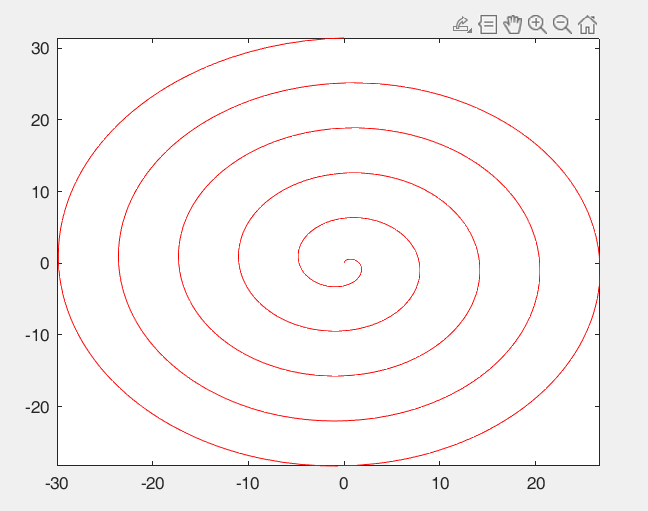 >> fplot(@(t)t.*sin(t),@(t)t.*cos(t),[0,10*pi],'r')