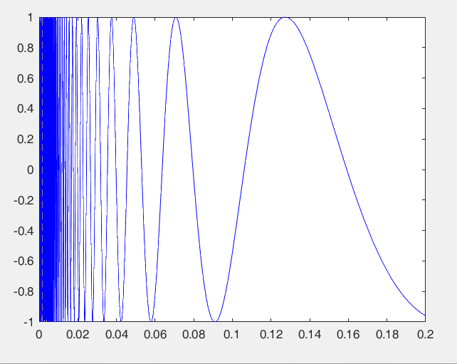 >> fplot(@(x)sin(1./x),[0,0.2],'b'),这里sin(1./x)此仍为一个向量,每个元素取了倒数。