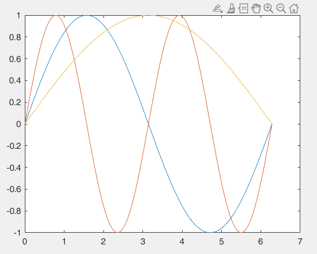 >> x=linspace(0,2*pi,100); >> y=[sin(x);sin(2*x);sin(0.5*x)]; >> plot(x,y)