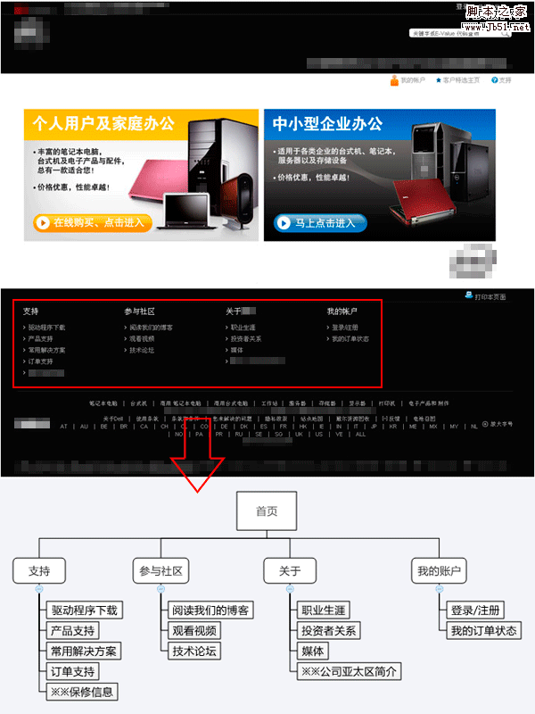 这是某电脑公司的官方网站,他们的导航本身就是一个站点地图。他们将14项内容分级组成了一个两层的结构树,每个分支上都有3-4项内容。对于这样一个信息量不是很庞杂的网站来说,使用主题或科目的方案,将信息组成一个两层的结构树,就是一种深广度平衡的方式。
