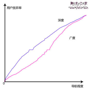对于那些信息量很大很杂的网站来说,单纯的使用某一种按类分组的方案已经不太适用了。一般来说,广度比深度的效果更好。在深结构的各级别间选择,比起在广导航的各选项间扫视,要付出更多精力。眼睛比起鼠标点击(和页面载入)要快得多。虽然用户在深结构更容易迷失方向,甚至可能迷路,但也不要在广度上走得太远。任何时候都把所有链接展示出来会吓倒用户,让他难以选择。用户会点击看起来适合他们需要的第一个选项,或者干脆放弃,下图清晰的阐述了用户放弃率和深广度之间的关系: