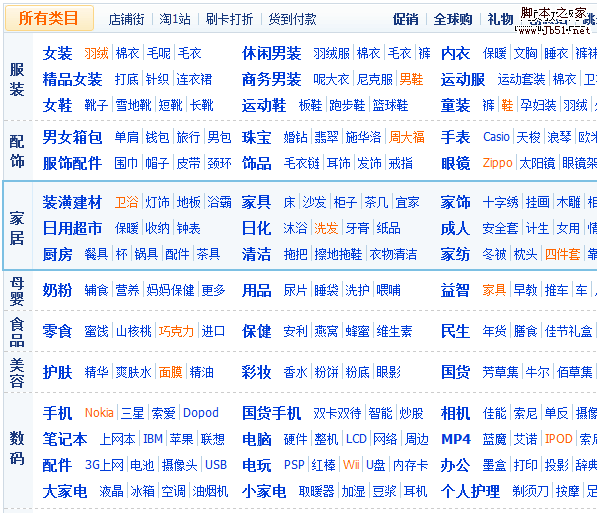 淘宝首页类目地图大概有300个类目,使用了三层结构将他们清晰得展示出来,每层类目都是4~12个之间,是一个深广度保持平衡的典型案例,图8:
