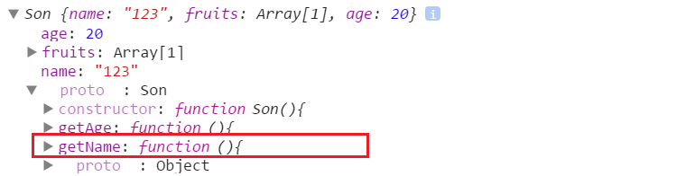 上面我在Son函数里加了Parent.call(this)实现在new Son()的时候将this[即new 出来的Son对象]冒充成Parent函数里的上下文this来调用Parent()函数,从而拿到了父对象的属性和方法副本,所以在接下来修改父对象的属性和方法时其实是修改的副本,故达到了不会影响全部子对象的效果。但是由于Son.prototype=new Parent()的使用,我们得到了两份实例的属性和方法,而再我们拿到了副本以后,只是需要父对象的原型就行了,从下面可以看出我们只需要原型中的getname();