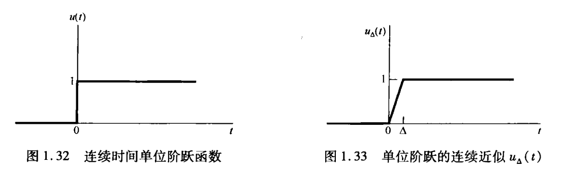连续时间单位冲激是连续时间单位阶跃的一次微分。相反地,连续时间单位阶跃是单位冲激的积分函数。理想状态下的连续时间单位阶跃函数在t=0处,按照严格的数学定义,是不可微的,因此要把它做一下近似处理,将函数值从0到1变化的时间定义为一个较短的时间间隔。