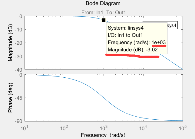 对其进行bode图分析可以看到 wc = 1000时的幅频特性(上式1000位置定义为 wc ) ,从幅频特性上可以看到,在衰减系数为 -3dB的时候频率为 1000rad/s 也就是我们设置的这个截止频率。注意,此时截止频率的单位 rad/s ,这个截止频率指的是角频率。