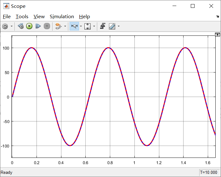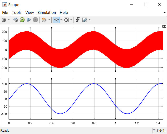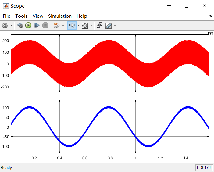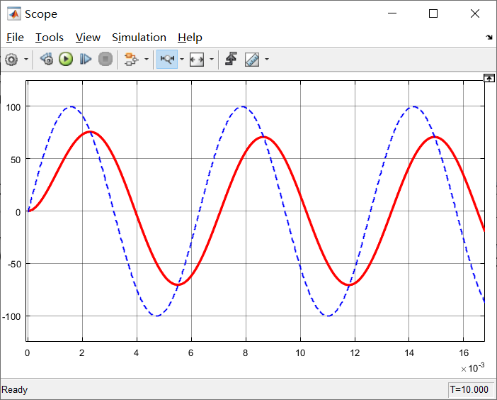 细心观察可以发现,此时滤波后的10rad/s的正弦波上还存在一些小的毛刺,这个时候就是可以对低通滤波器的参数进行调节和测试了。那么下面我们就试一下调节低通滤波器截止频率对输出波形的影响,也能够为以后调试低通滤波提供经验积累。