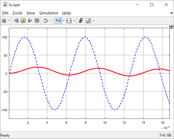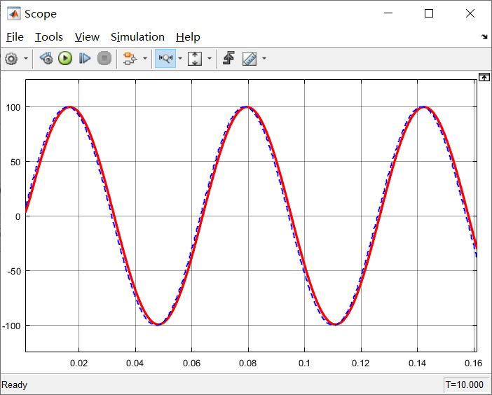 从以上仿真结果可以看出,在截止频率 wc = 10 rad/s 滤波虽然很明显,但是输出相对于理想的10rad/s正弦波也出现了幅值衰减和相位滞后;在截止频率 wc = 500 rad/s,正弦波上还存在一些小的毛刺,相对于截止频率 wc = 1000rad/s 的毛刺相对减小;在截止频率为 wc = 100 rad/s 时,输出波形于理想的 10rad/s正弦波基本一致,因此截止频率取到100rad/s较为合适。