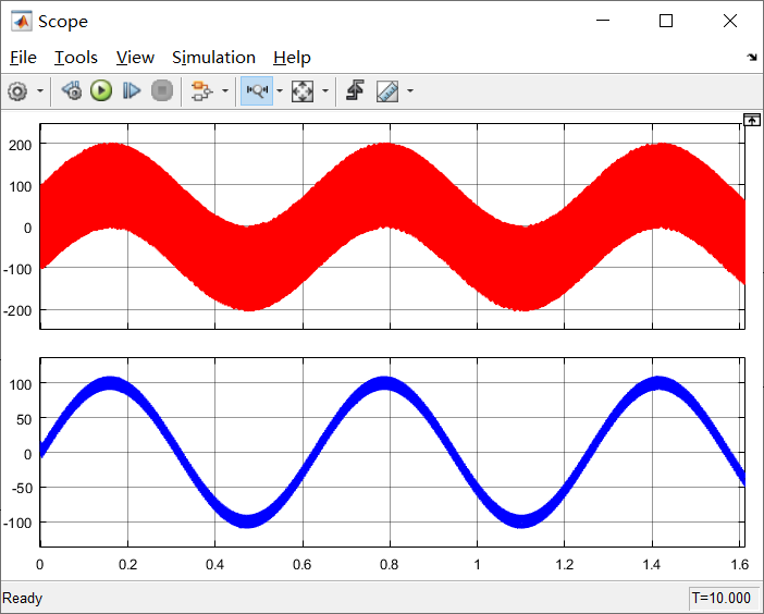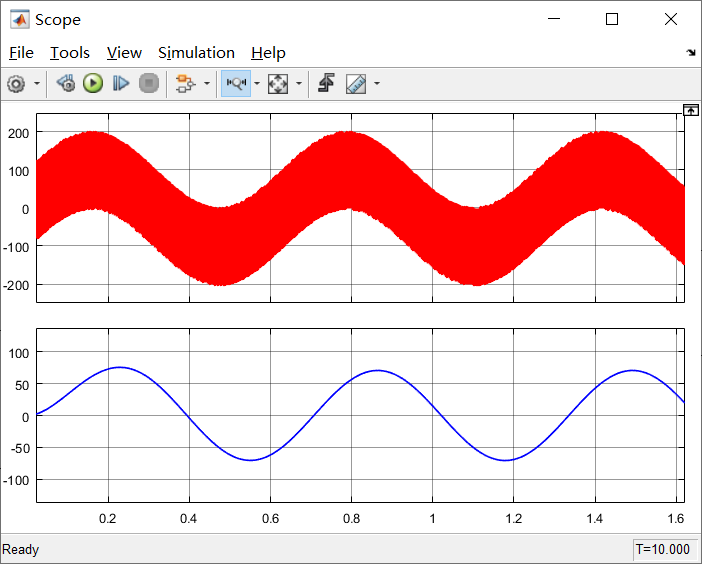 将10000rad/s的高频信号叠加到10Hz的信号上,然后经过低通滤波器,验证低通滤波器对高频噪声的滤除效果。