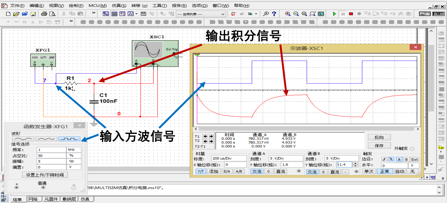 一阶低通滤波电路也称积分电路,能够实现相应的波形变化。如下图所示当输入方波信号时,输出信号发生一定改变。