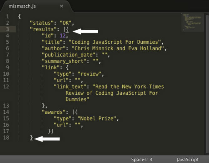 你能看出来哪里少了东西吗?当不确定的时候,一个好的编辑器将会非常有用。Sublime Text有一个很不错的功能,当你把光标放在某个大括号的时候,和它匹配的大括号会高亮出来。