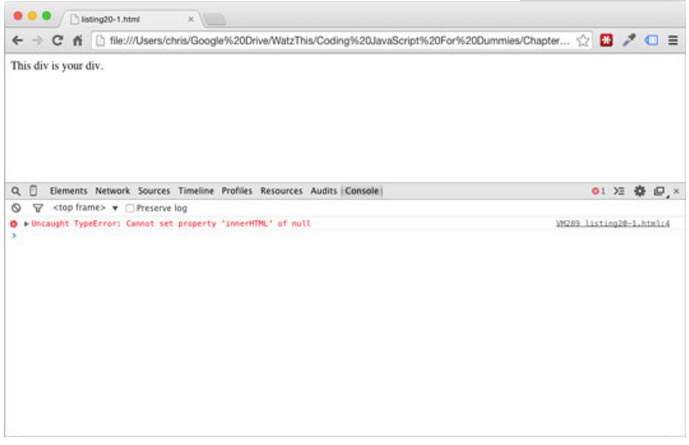 <html> <head> <script> document.getElementById(“myDiv”).innerHTML = “This div is my div”; </script> </head> <body> <div id = “myDiv”>This div is your div.</div> </body> </html>