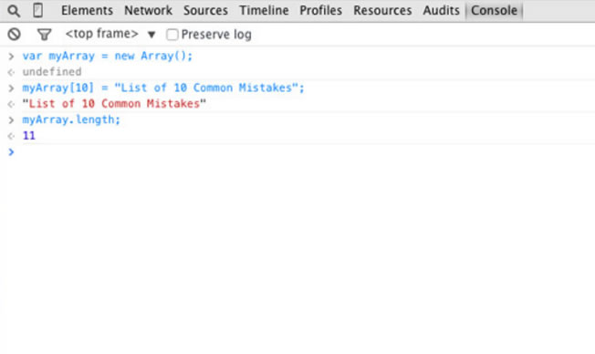 var myArray = new Array(); myArray[10] = “List of 10 Common Mistakes”; myArray.length; // 输出11!