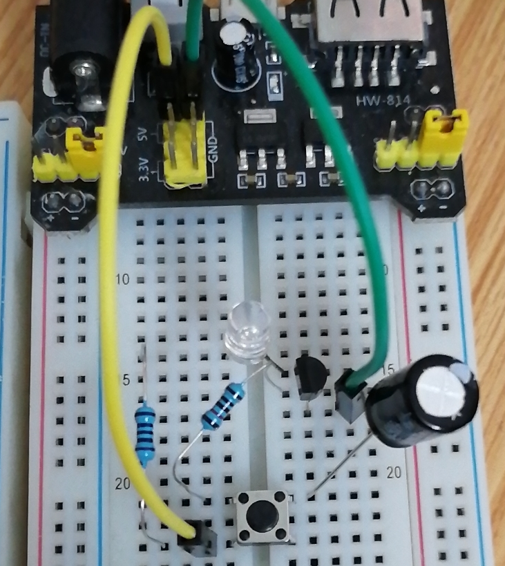 首先我们将电容和LED小灯泡相连接构成并联电路(请注意电容的正负极,正负极)。然后给电路接上一个开关,按下开关电路接通,此时LED小灯泡发光,且电容处在充电的状态。断开开关,LED小灯泡并不会马上熄灭,而是随着电容放电逐渐变暗,达到了延时的效果。