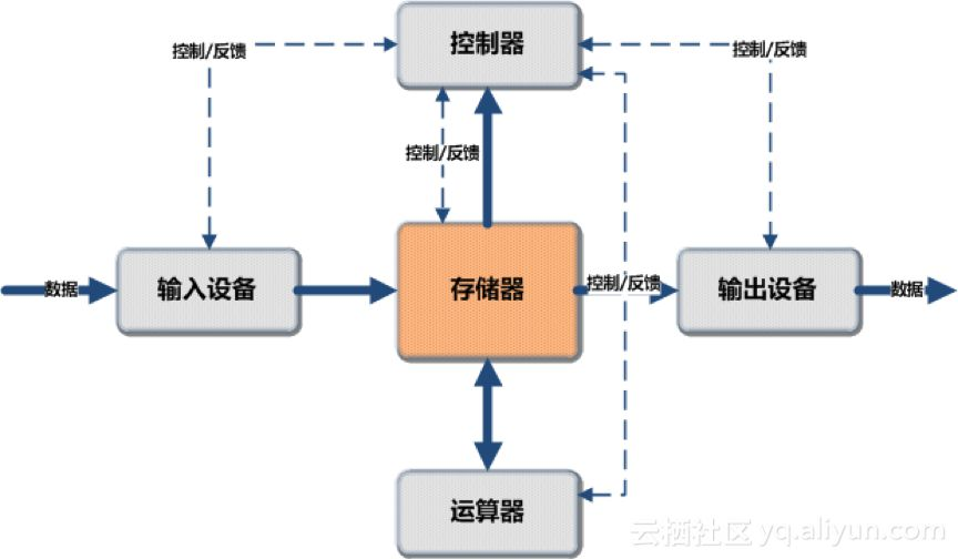 上面大概描述了计算机层次结构,那么具体的计算机里面由什么组成的?计算机主要由两大类,冯·诺伊曼计算机以及现代的计算机。无论是哪两种计算机,都是由运算器、存储器、控制器、输入设备和输出设备五大部件组成。冯·诺伊曼计算机是以运算器为中心,如图3.1所示。现代计算机是以存储器为中心,如图3.2所示。