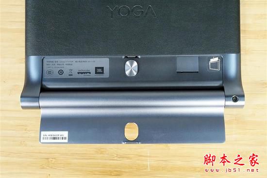 YOGA Tab 3 Plus 的背面主体采用类皮革材质,能够更好地抵抗指纹侵扰,看起来也更上档次。中心位置印有 YOGA 标识。