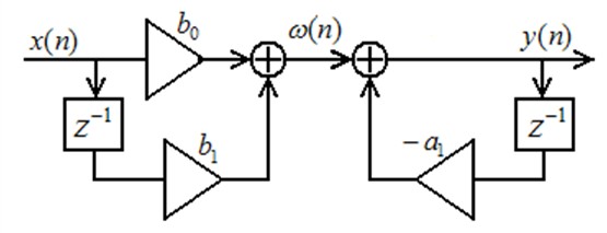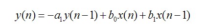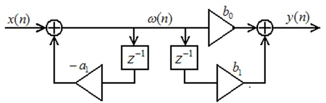 很明显的,要实现这个滤波器,我们需要2个单位的存储空间,用来存储过去的输入值与输出值。这样的话,考虑N阶的滤波器,我们就需要2N个存储单元。这种结构被称作直接I型结构。