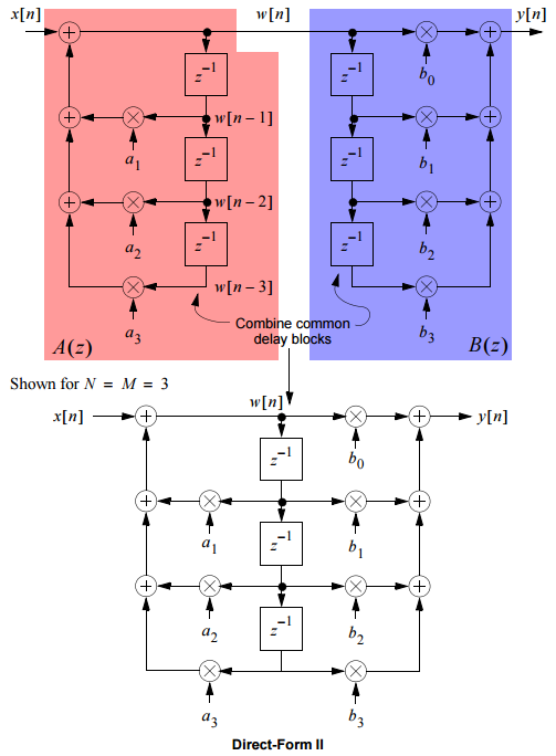 可以看出直接Ⅰ型滤波器需要N+M个延时单元(N≥M)。直接Ⅱ型结构是对直接Ⅰ型的变型,将上面网络的零点与极点的级联次序互换,并将延时单元合并。实现N阶滤波器只需要N个延时单元(The Direct-Form II structure uses fewer delay blocks than Direct-Form I),故称为典范型。