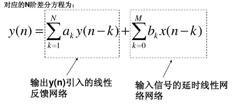 IIR数字滤波器是一类递归型的线性时不变因果系统,其差分方程可以写为:$$y(n)=sum_{i=0}^{M}a_ix(n-i)+sum_{i=1}^{N}b_iy(n-i)$$