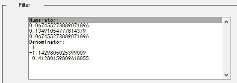 按照上面的公式,滤波器差分方程为:y[n] = 0.06745527*x[n] + 0.134910547*x[n-1] + 0.06745527*x[n-2] - (-1.1429805025)*y[n-1] - (0.412801596)*y[n-2]