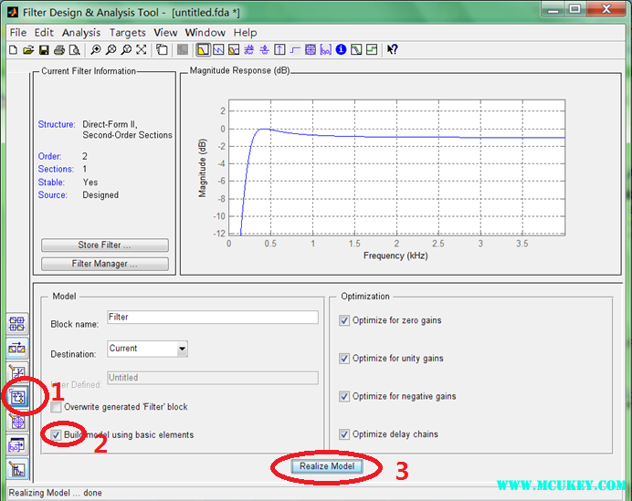 滤波器设计完成后还可以生成Simulink模型进行仿真:按照下图中数字标号进行,第一步点击左边Realize Model图标,第二步勾选“Build model using basic elements”这一项,右边四个灰色的项将自动打钩,最后点击“Realize Model”,matlab将自动生成滤波器模型,在弹出的窗口中双击模型可以观察该模型的内部结构。