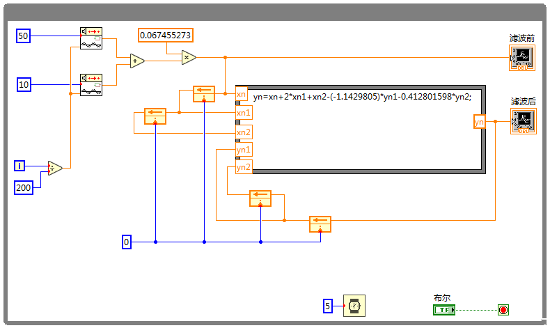 在LabVIEW中为了自己实现IIR滤波器可以使用反馈结点来存储数据,下面的程序框图实现了与MATLAB模型相同的功能: