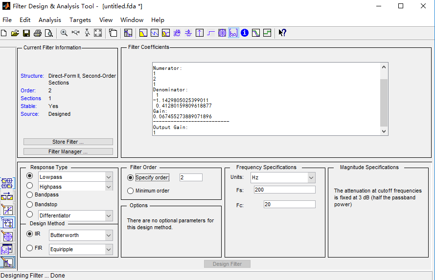 高阶IIR滤波器的实现是采用二阶滤波器级联的方式来实现的。默认情况下,Filter Coefficients把结果分成多个2阶Section显示,其中还有增益。增益的目的是为了保证计算的精度和系统的稳定性。选择[edit]→[Convert to Single Section],这时候系数变成我们熟悉的形式: