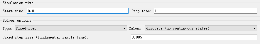 使用生成的滤波器搭建一个简答的测试模型:将两个幅值为1,频率分别为10Hz、50Hz的正弦波叠加,输入滤波器后观察滤波前后的波形。仿真时间设为1s,仿真参数中求解器类型设为固定步长,求解器选择discrete(它适用于离散无连续状态的系统),步长设为0.005s(200Hz)