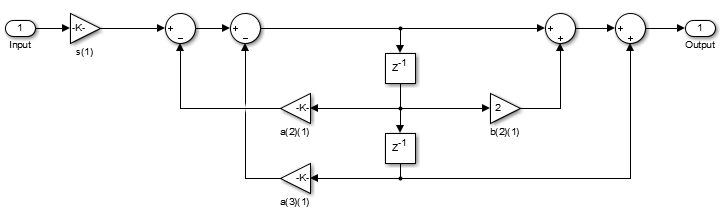 下面是按照设计要求生成的2阶滤波器直接Ⅰ型的结构: