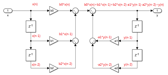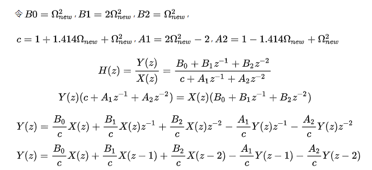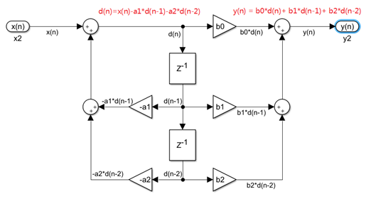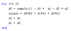 从框图中可以直观的看见使用了4个z^-1(延时模块),从代码里也可以看见,我们需要保存4个过去的值(x(n-2),x(n-1),y(n-2),y(n-1)),