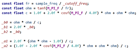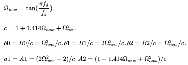 根据我们之前的推导,这个差分方程的系数只跟数字截止频率 Fd,和采样频率 Fs 有关。