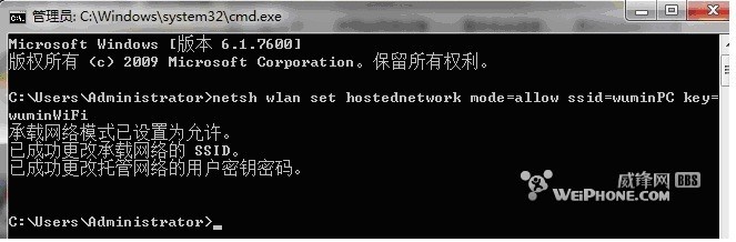 运行命令:netsh wlan set hostednetwork mode=allow ssid=wuminPC key=wuminWiFi