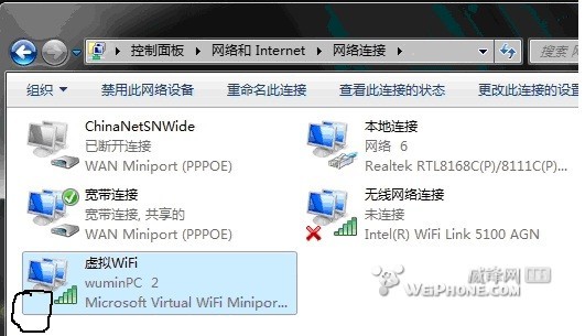 开启成功,网络连接中会多出一个网卡为“Microsoft Virtual WiFi Miniport Adapter”的无线。
