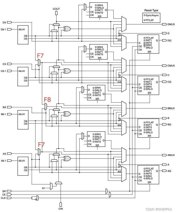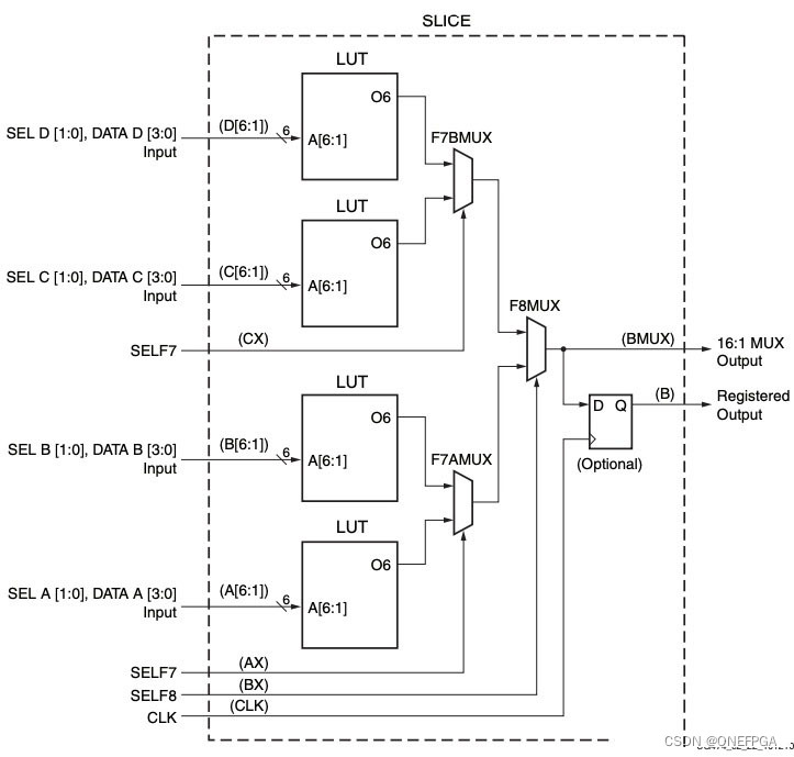 此外,1个SLICE除了包含LUT,还有3个多路选择器(F7AMUX, F7BMUX, and F8MUX),F7的意思是与LUT6和1个额外输入组成1个7输入选择器,F8代表与LUT6和2个F7MUX额外输入共组成8输入选择器。可参见如下示意图: