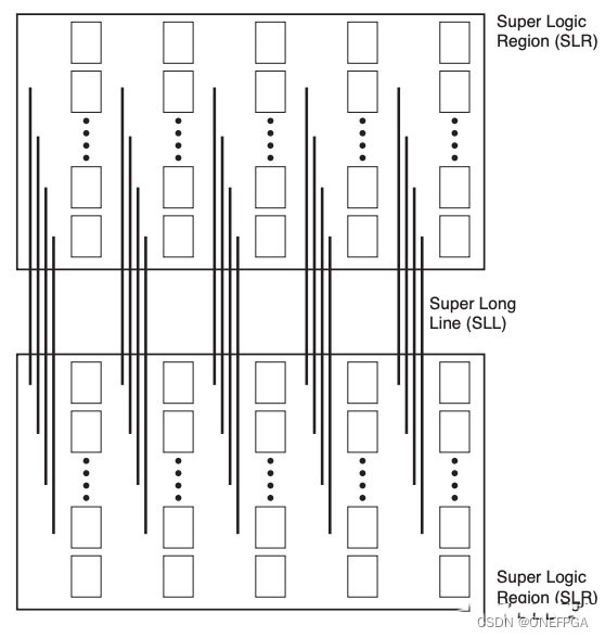 然后现在的Xilinx FPGA基本会用2个Die拼接,也就是SLR(超级逻辑区),这两个Die拥有独立逻辑资源和布线资源,中间用SLL(Super Long Line)连接,所以vivado有自己的跨die寄存器,两个寄存器用SLL连接来优化timing问题。结构如下图所示: