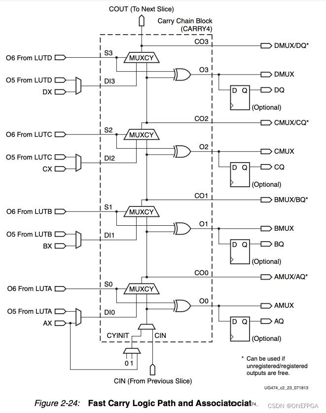 SLICE另一个重要资源就是加法器进位链,每个SLICE中有一个4bit加法器进位链,也叫CARRY4,可以与前后级SLICE组成更长的进位链,其结构如下图所示: