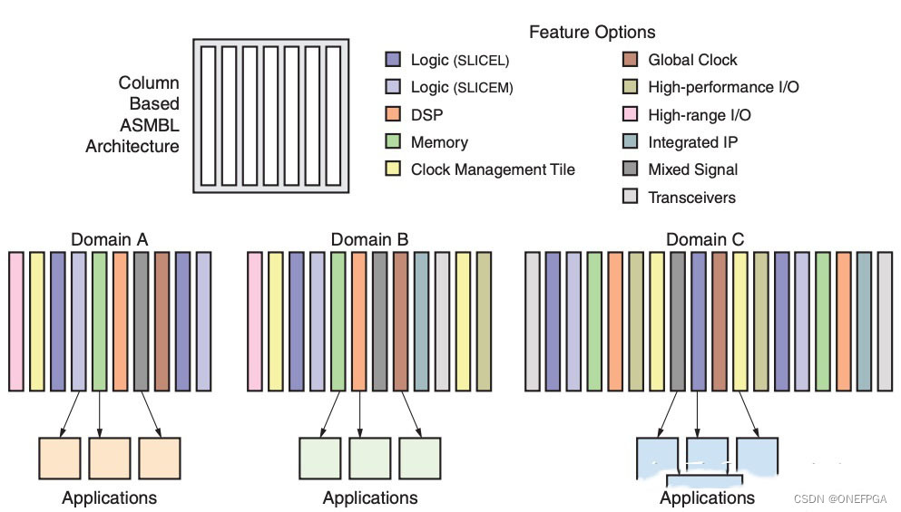 高级硅模块如上图所示,我理解就是Xilinx创造出的一种FPGA架构,将资源按列划分,所以我们在Vivado Device视图的时候也可以看到一列一列的资源,有利于后续布局布线、IO口分布、增强片上功率等等。