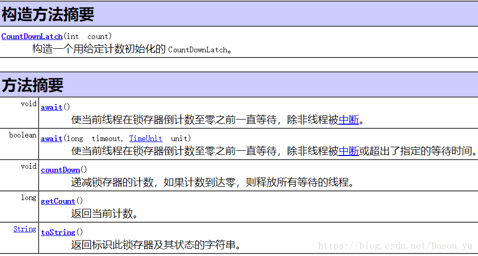用给定的计数 初始化 CountDownLatch。由于调用了 countDown() 方法,所以在当前计数到达零之前,await 方法会一直受阻塞。之后,会释放所有等待的线程,await 的所有后续调用都将立即返回。这种现象只出现一次——计数无法被重置。如果需要重置计数,请考虑使用 CyclicBarrier。CountDownLatch 是一个通用同步工具,它有很多用途。将计数 1 初始化的 CountDownLatch 用作一个简单的开/关锁存器,或入口:在通过调用 countDown() 的线程打开入口前,所有调用 await 的线程都一直在入口处等待。用 N 初始化的 CountDownLatch 可以使一个线程在 N 个线程完成某项操作之前一直等待,或者使其在某项操作完成 N 次之前一直等待。