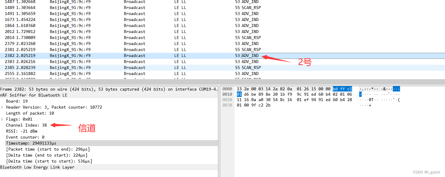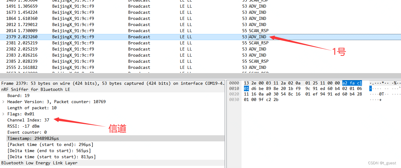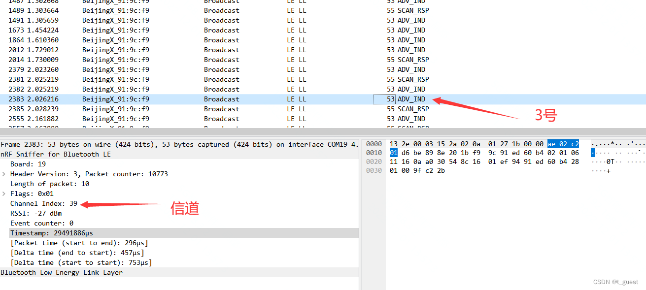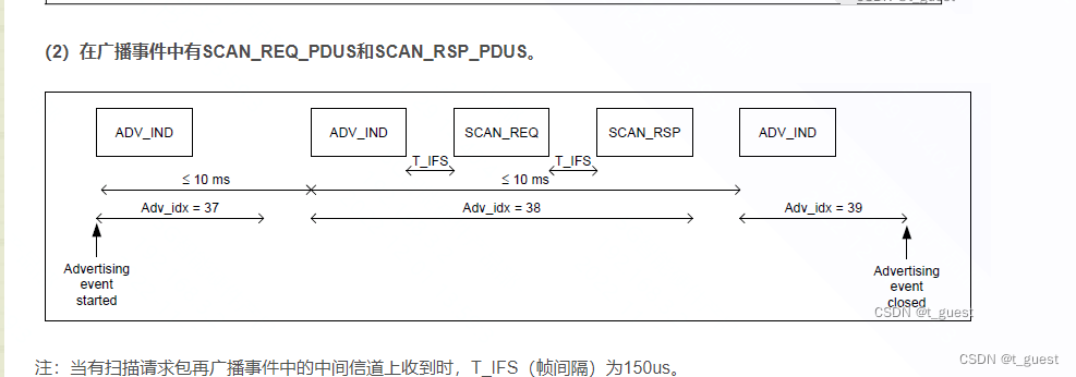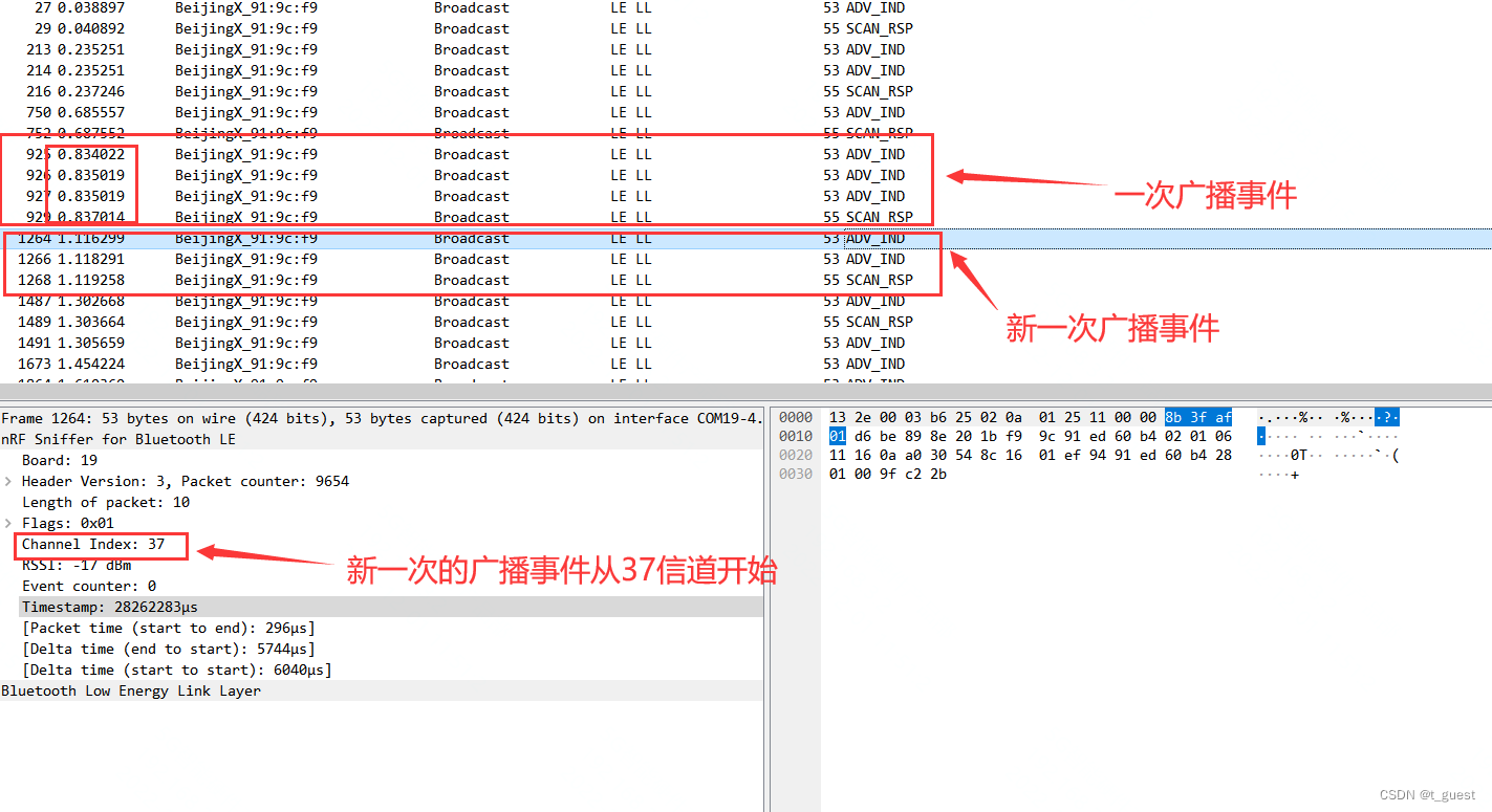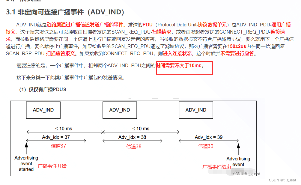 还记得在上一章的内容吗?蓝牙总共有40个信道,而广播是在37、38、39三个信道依次发送。且广播间隔不超过10ms。不记得得话,可以回去复习一下。蓝牙学习四(广播)_t_guest的博客-CSDN博客