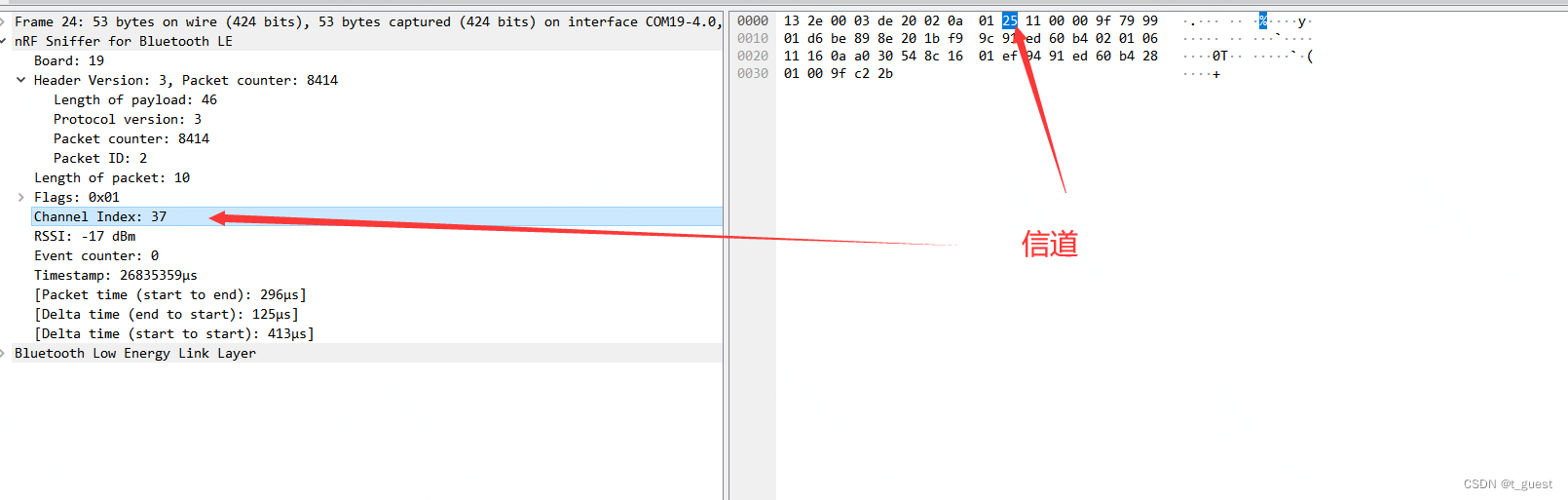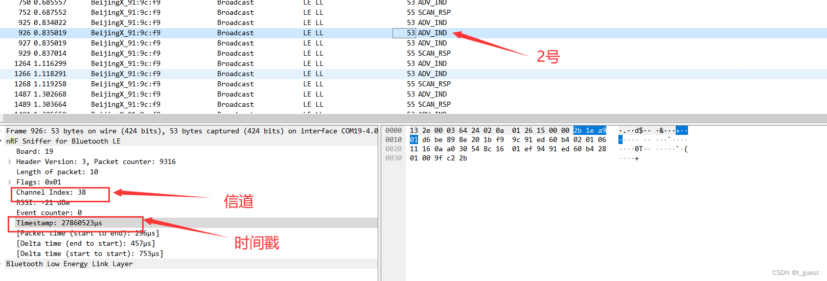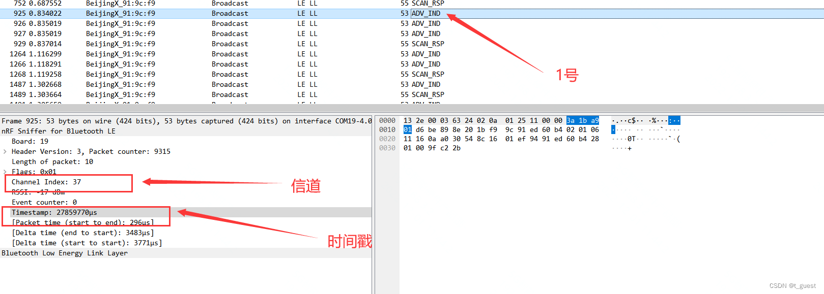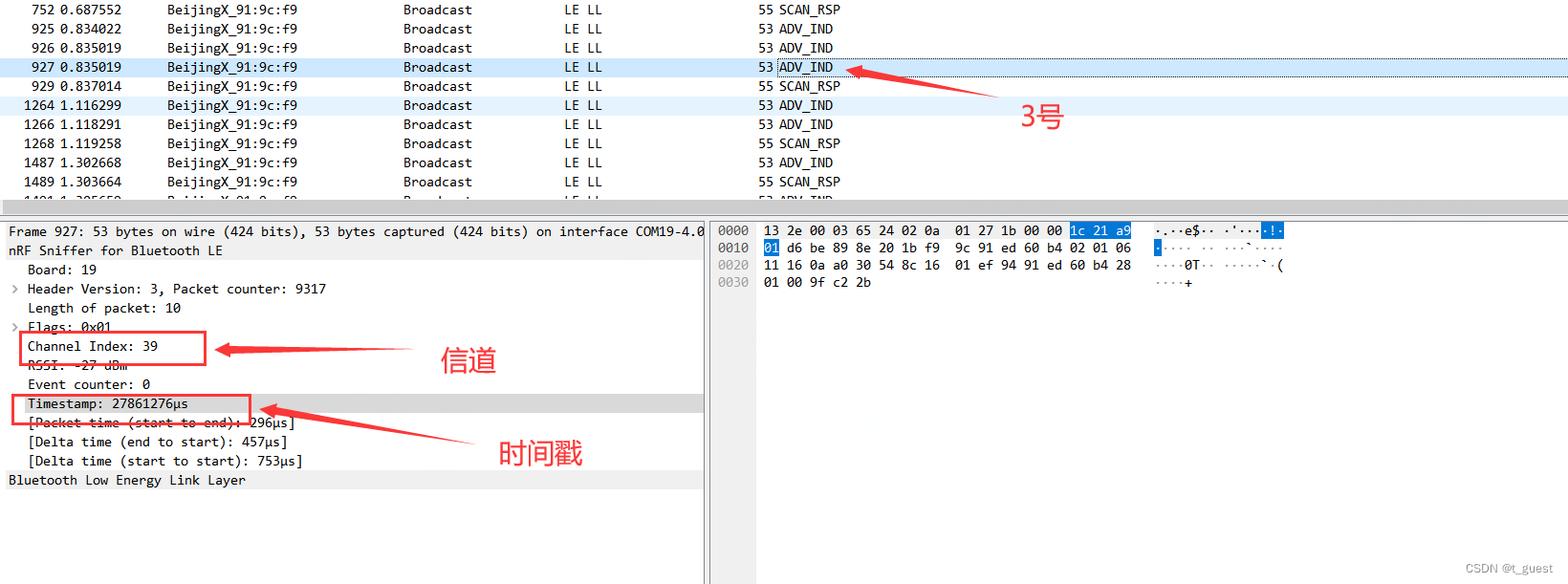 还记得在上一章的内容吗?蓝牙总共有40个信道,而广播是在37、38、39三个信道依次发送。且广播间隔不超过10ms。不记得得话,可以回去复习一下。蓝牙学习四(广播)_t_guest的博客-CSDN博客