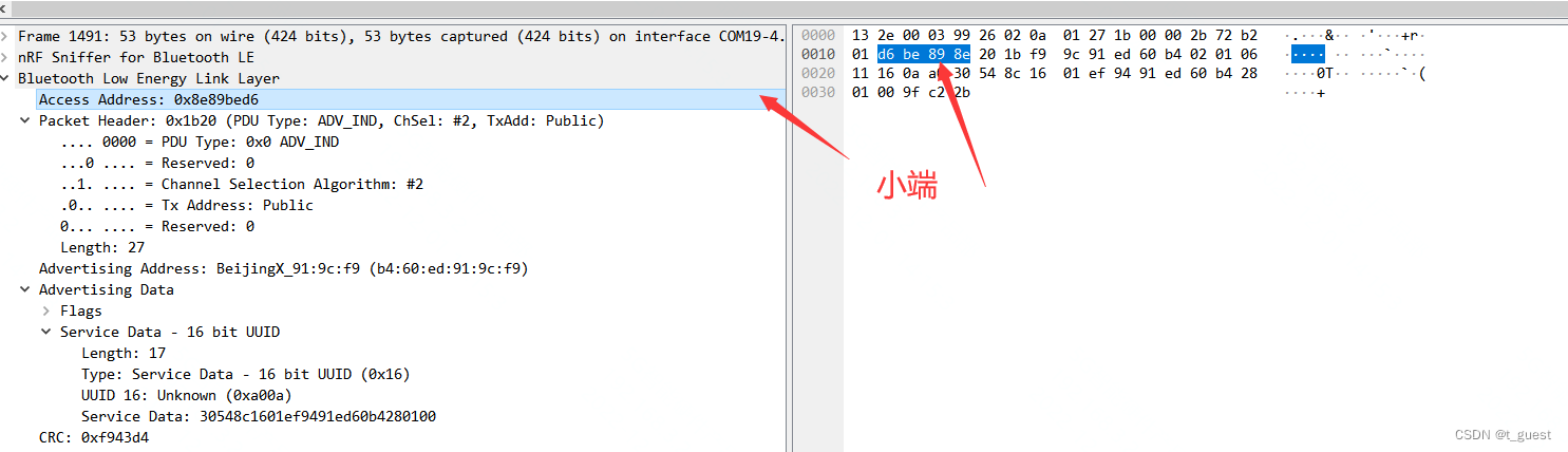 4字节,小端。上图的值为 0x8e89bed6。所以BLE设备的广播帧都是使用这个地址。
