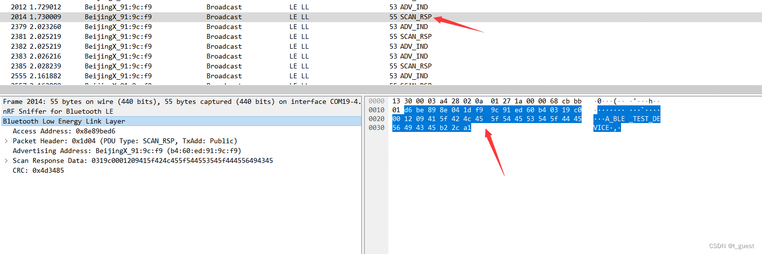 因为SCAN_RSP是对SCAN_REQ的回应,所以其中会包含一些其他的信息。这些信息是程序中自己设置的。此次抓的包中内容为外貌和设备名称。scanner也就是获得了这些内容,才知道扫描到的设备是什么类型,叫什么名字。