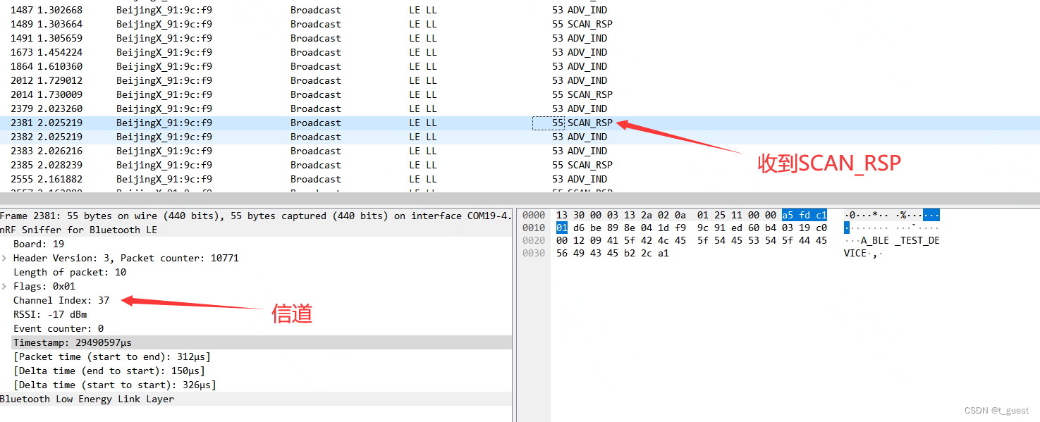 可以看到,此时广播是从37信道开始,依次为37、38、39信道。当在39信道广播数据后,收到了SCAN_RSP。此时则停止广播。下次再进行广播的话,又从37信道开始。