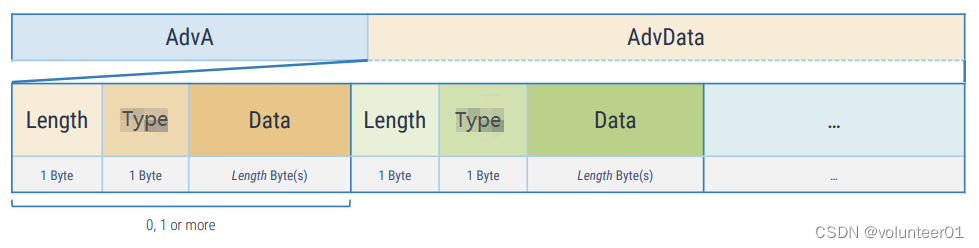 上一篇提到广播报文数据包含N个AD Structure,每个AD Structure由Length,AD Type和AD Data组成,最少是0个字节,最多可达31个字节。因此,报文数据部分的结构如下图所示。