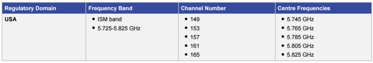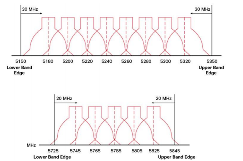 IEEE 802.11a规范为UNII1频段指定了四个信道,为UNII2频段指定了四个信道,并且UNII3波段的四个通道。这些信道间隔为20兆赫,被认为是非干扰的;