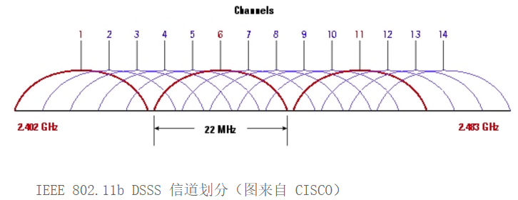 2.4GHz(=2400MHz)频带的信道划分。实际一共有14个信道(下面的图中画出了第14信道),但第14信道一般不用。
