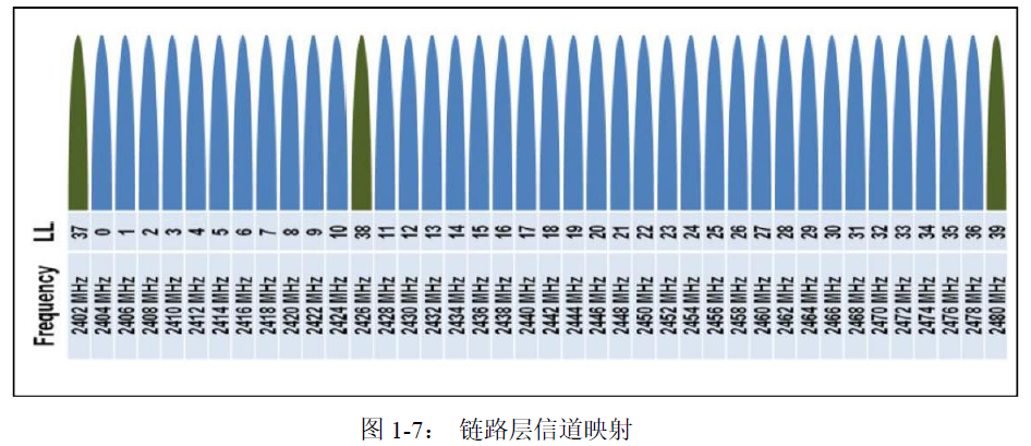 广播信道:37 、38、39,对应的中心频率是2402MHz,2426MHz,2480MHz。广播信道之间至少相差24MHz。每次广播,都会在3个信道上将广播数据发送一次,这能有效地避免干扰,即使一个信道存在干扰,另外的信道也可以很好地工作,而三个信道同时被干扰的情况极少。
