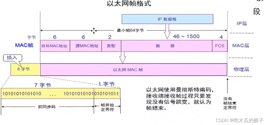 在物理层中会在头部插入8个字节 的前同步码,用来时钟同步