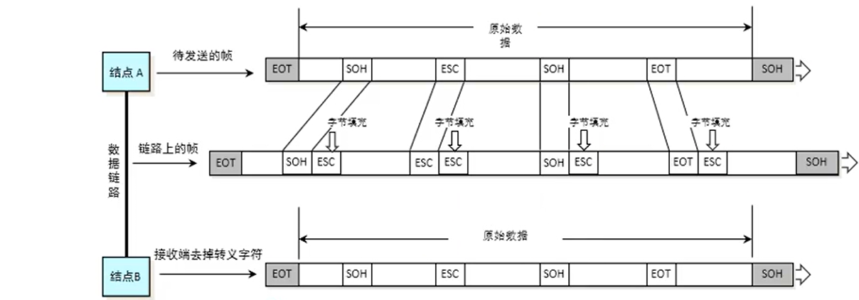④所以就引入了转义字符ESC,即在数据中出现的SOH、ESC、EOT字符编码之前的位置插入转义字符ESC的编码。如图所示就是透明传输过程。